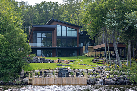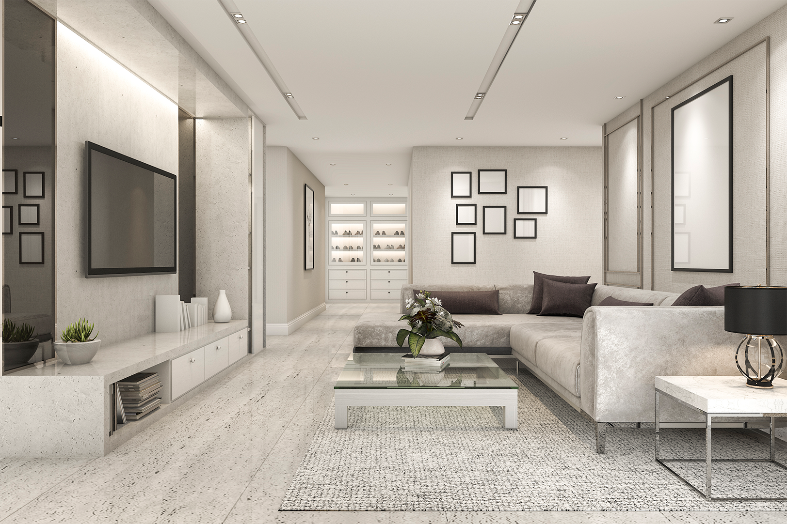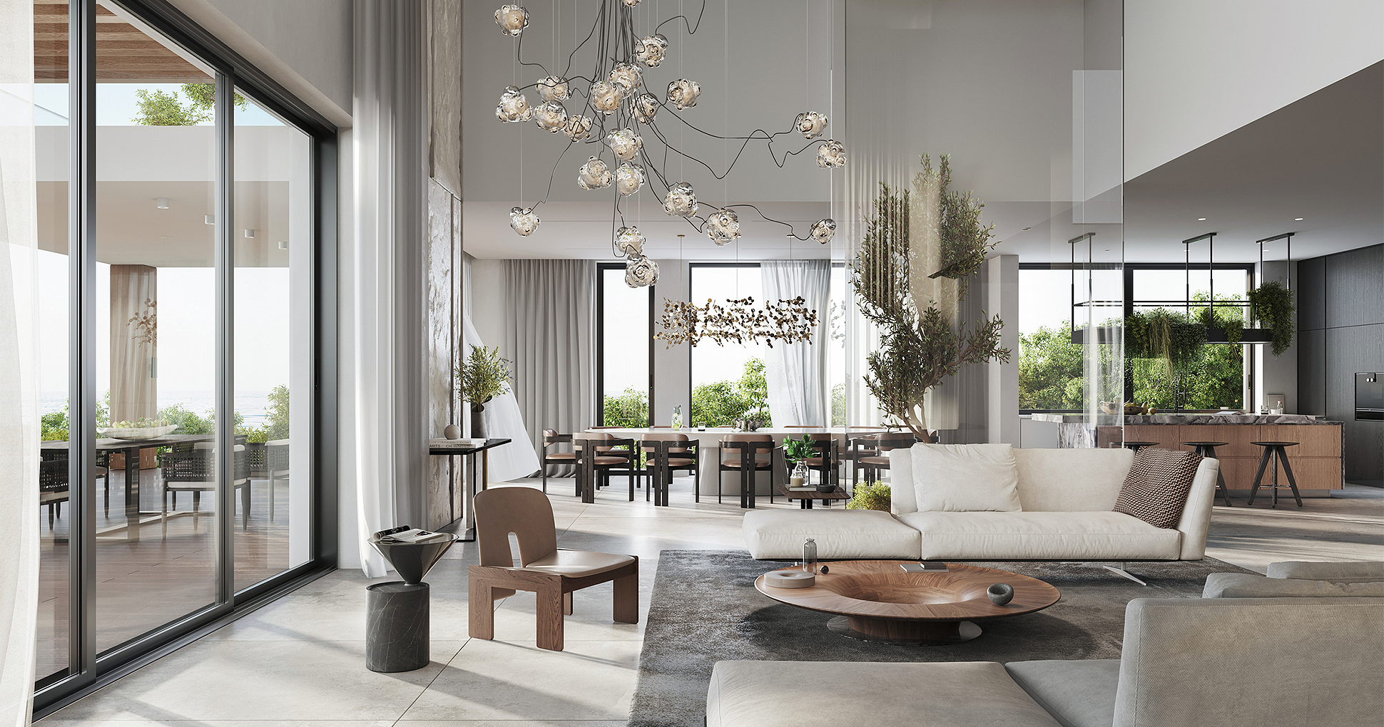 Modern luxury interior living space with large windows, comfortable sectional sofa, and elegant dining area showcasing RLG Development's quality craftsmanship